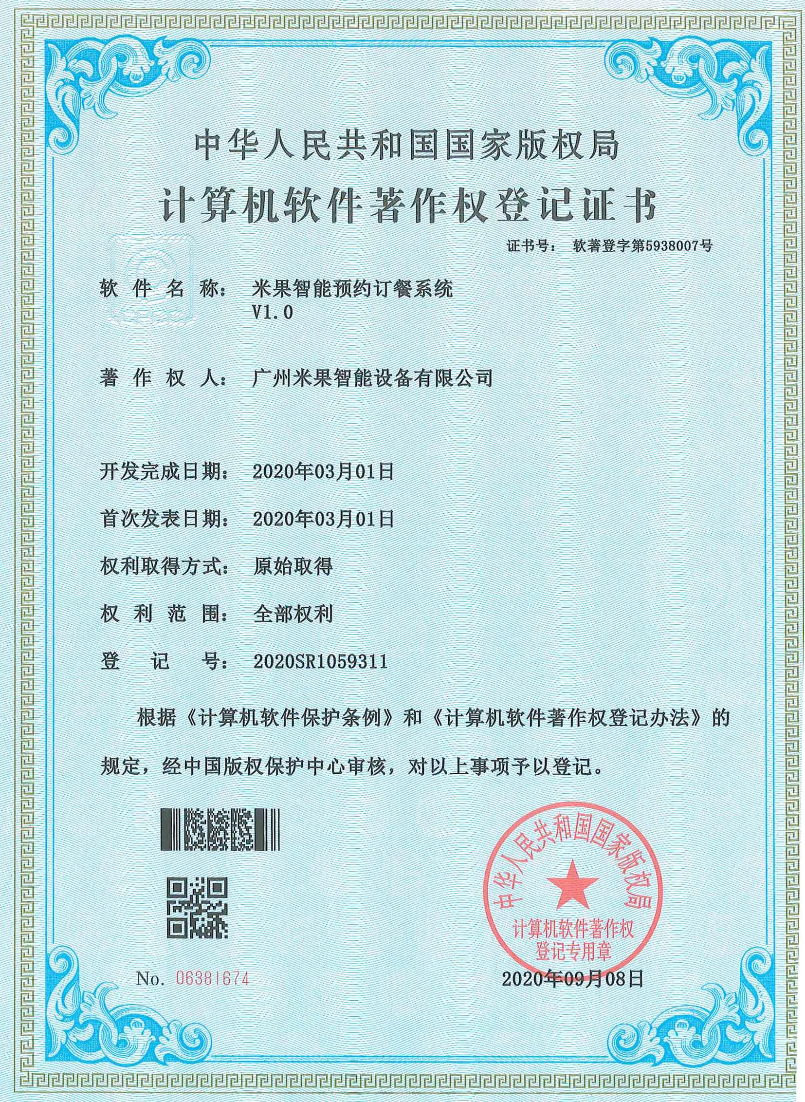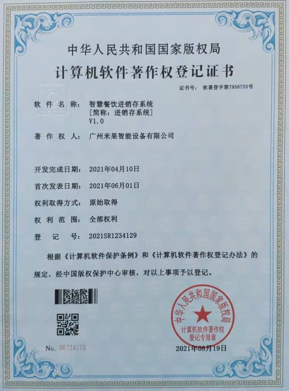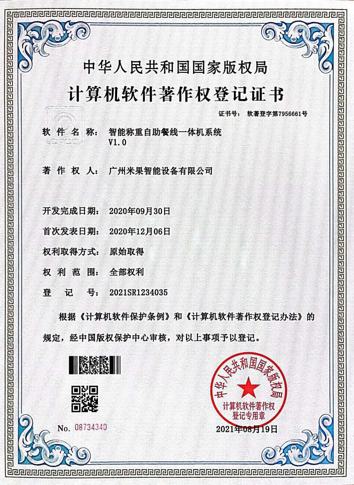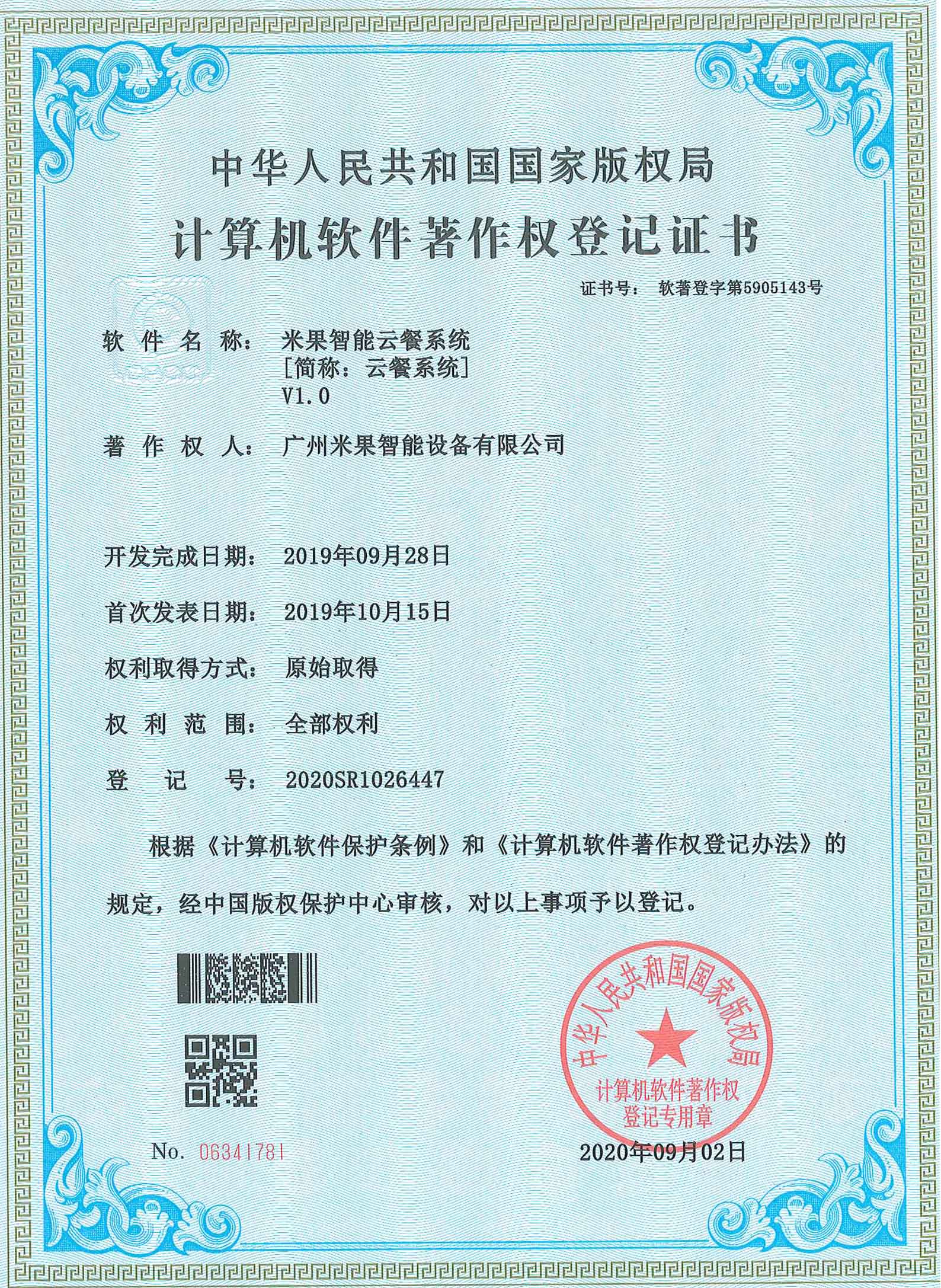 研发智慧食堂数字化系统和配套设备:获《智能售货机促销系统》《智能售货机会员管理系统》《米果微超小程序软件》《米果智能云餐系统》软件著作权证书;获《一种餐厅自动称量设备》实用新型专利证书; 获颁《广东省守合同重信用企业》