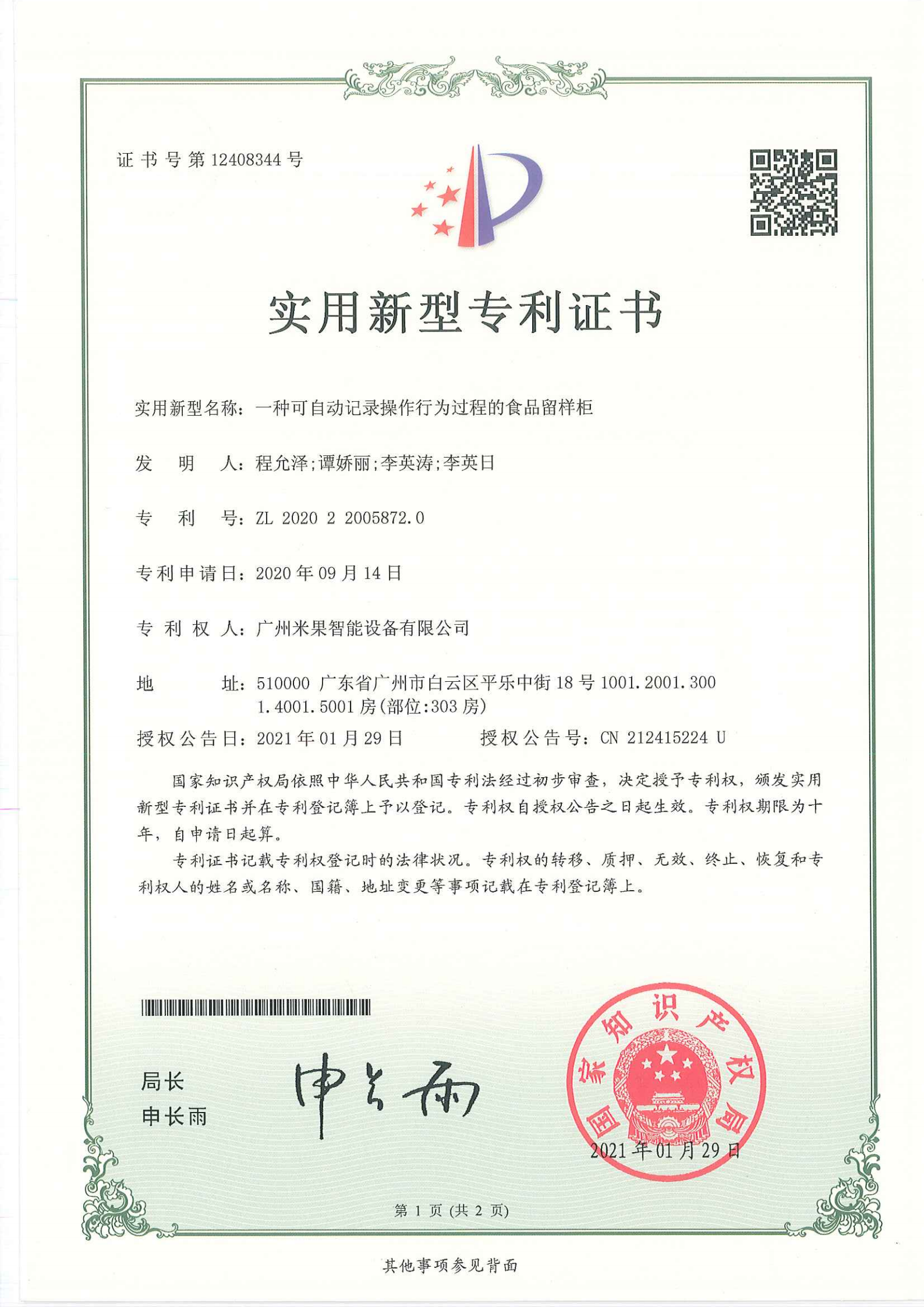 获《食品安全监管综合平台》《米果智能预约订餐系统》软件著作权证书;获《一种可自动记录操作行为过程的食品留样柜》 《一种餐盘发放柜》实用新型专利证书;获《一种可自动记录操作行为过程的食品留样柜》发明专利;